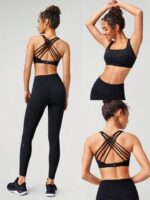 Top deportivo tipo sujetador con tirantes cruzados, escote cuadrado y espalda descubierta. Ofrece soporte ligero ideal para yoga, pilates o uso diario. Tela tricotada de estiramiento medio con almohadillas removibles.
