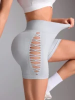 Short deportivo con cintura ultra alta y diseño cruzado con abertura lateral. Tejido sin costuras y ajuste ceñido que moldea sin apretar. Ideal para yoga, gimnasio o ciclismo. Incluye bolsillo funcional.